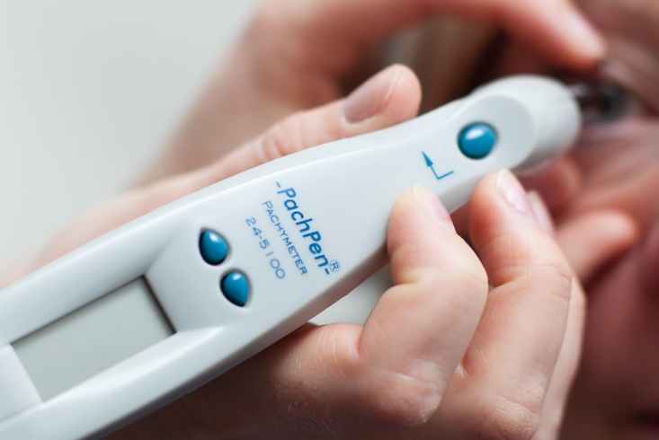 A Pachymeter is a medical device used to measure the thickness of the cornea. Pachymetry, the corneal thickness measurement, has a number of uses in comprehensive Optometric care. Pachymetry is extremely important in determining whether laser eye surgery (PRK, LASIK or Intralase) is suitable for a patient. No matter which type of refractive laser surgery is performed, corneal tissue is removed in the re-contouring of the cornea. The higher the prescription, the more tissue removed. Naturally, there must be a limit to the amount of tissue removed. Pachymetry allows us to determine if a patient has enough tissue to safely have laser surgery. Corneal pachymetry is an important test in the early detection of certain types of glaucoma. It also can be used in the screening of Keratoconus, a progressive corneal condition. Modern Pachymetry devices, such as the one used in our office, use ultrasound technology. The test is of a very similar technique to when the intraocular pressure measurement is performed. A numbing drop is instilled into the eye and the Pachymeter is applied immediately. The results are instantaneous. Normal corneal thickness is typically between 520 to 550 microns. |
